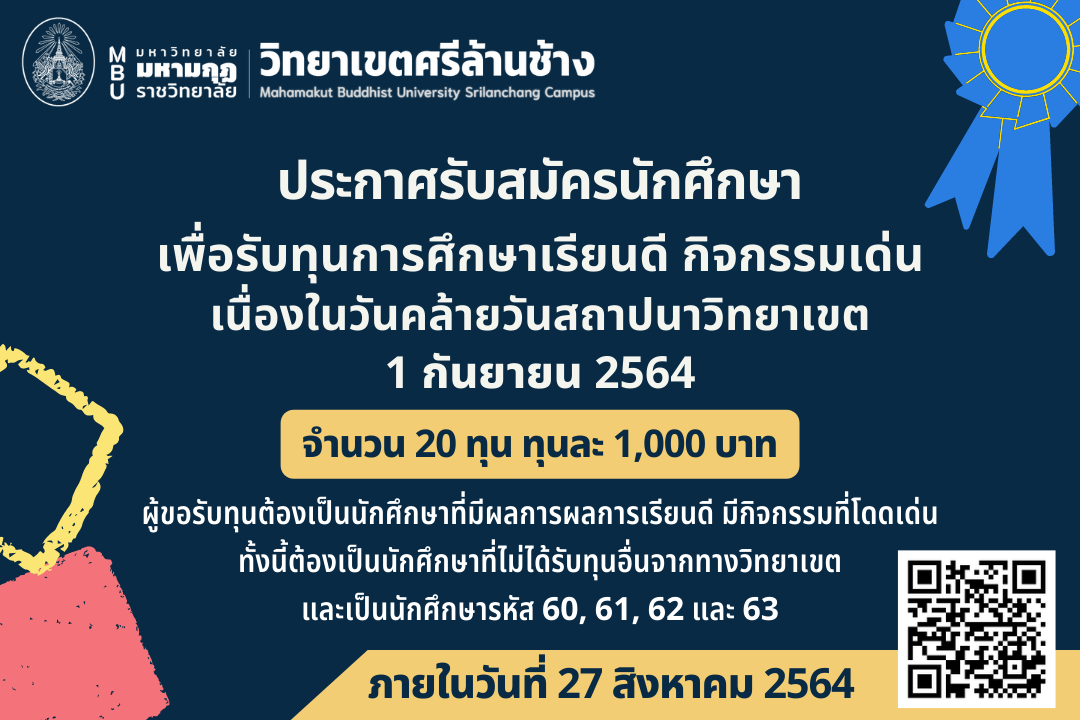 ด้วยมหาวิทยาลัยมหามกุฏราชวิทยาลัย วิทยาเขตศรีล้านช้าง มีนโยบายจัดสรรทุนการศึกษาจำนวน 20 ทุน ทุนละ 1,000 บาท มอบให้ในวันคล้ายวันสถาปนา มหาวิทยาลัยมหามกุฏราชวิทยาลัย วิทยาเขตศรีล้านช้าง 1 กันยายน 2564 เพื่อเป็นการส่งเสริมและให้กำลังใจนักศึกษาที่มีผลการเรียนดี และกิจกรรมเด่น และเพื่อส่งเสริมให้นักศึกษาเห็นความสำคัญในบทบาทหน้าที่ในกิจกรรม หรือชุมนุม หรือกิจการนักศึกษา จึงออกประกาศรับสมัครนักศึกษาเพื่อรับทุนการศึกษาเรียนดี กิจกรรมเด่น ประจำปีการศึกษา 2564 มีรายละเอียด ดังนี้