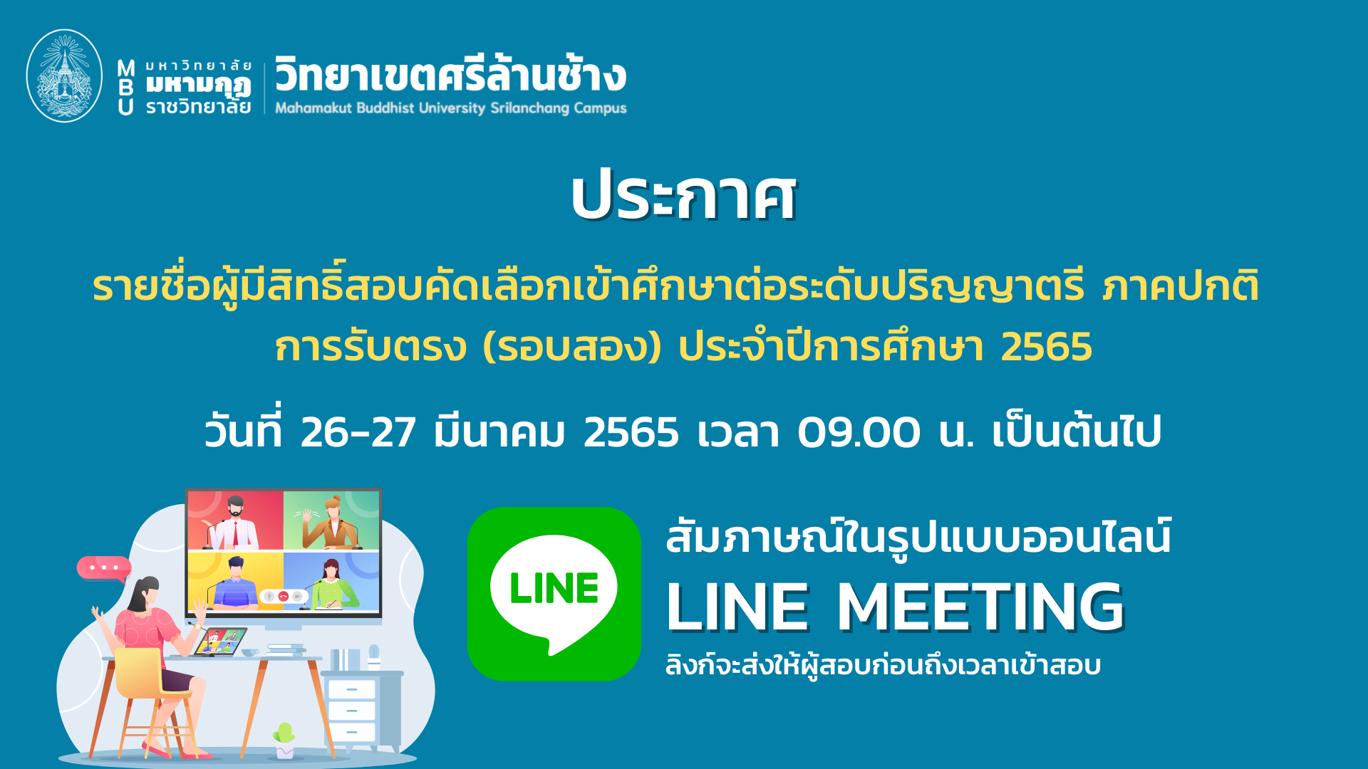 รายชื่อผู้มีสิทธิ์สอบคัดเลือกเข้าศึกษาต่อระดับปริญญาตรี ภาคปกติ การรับตรง (รอบสอง) ประจำปีการศึกษา ๒๕๖๕