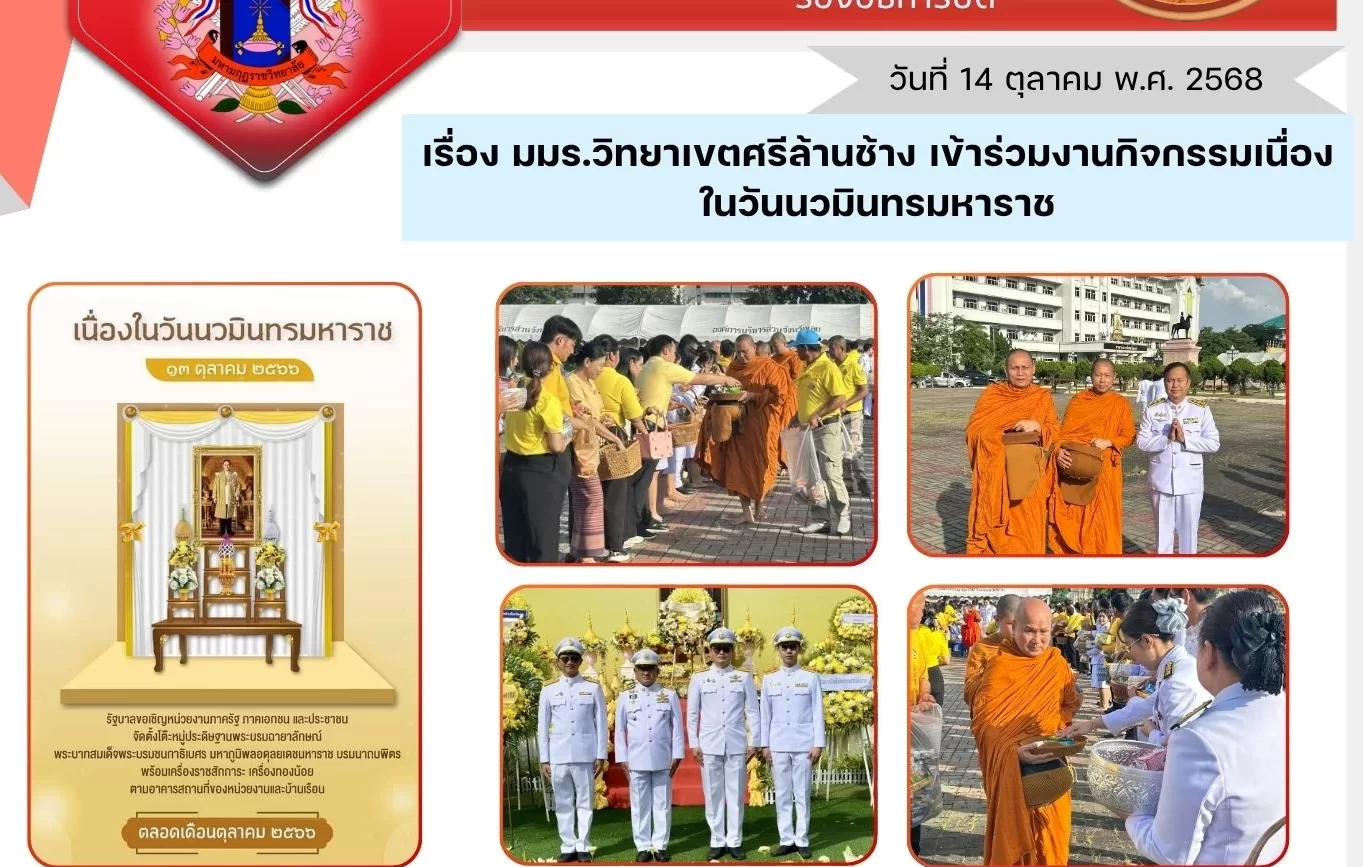 วันที่ 13 ตุลาคม 2568 มหาวิทยาลัยมหามกุฏราชวิทยาลัย วิทยาเขตศรีล้านช้าง เข้าร่วมกิจกรรมเนื่องในวันนวมิทรมหาราช โดยมี นายชัยพจน์ จรูญพงศ์ ผู้ว่าราชการจังหวัดเลย เป็นประธานฝ่ายฆราวาสในพิธีทำบุญตักบาตรพระสงฆ์จำนวน 89 รูป เพื่อถวายพระราชกุศลและน้อมรำลึกถึงพระมหากรุณาธิคุณ พระบาทสมเด็จพระบรมชนกาธิเบศร มหาภูมิพลอดุลยเดชมหาราช บรมนาถบพิตร เนื่องในวันนวมินทรมหาราช โดยมี ข้าราชการตุลาการ ทหาร ตำรวจ พลเรือน หัวหน้าส่วนราชการ ภาครัฐวิสาหกิจ ภาคเอกชน องค์กรปกครองส่วนท้องถิ่น และประชาชน เข้าร่วมพิธี โดยมี พระราชวชิรสุธี เจ้าอาวาสวัดศรีสุทธาวาส (วัดเลยหลง) เป็นประธานฝ่ายสงฆ์ จากนั้น ผู้ว่าราชการจังหวัดเลย ได้นำส่วนราชการและหน่วยงานต่าง ๆ ร่วมวางพวงมาลาถวายราชสักการะ