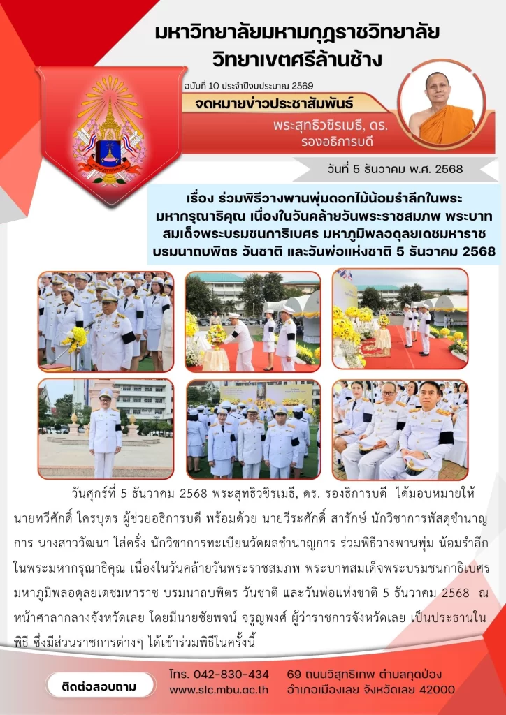 วันศุกร์ที่ 5 ธันวาคม 2568 พระสุทธิวชิรเมธี, ดร. รองธิการบดี ได้มอบหมายให้ นายทวีศักดิ์ ใครบุตร ผู้ช่วยอธิการบดี พร้อมด้วย นายวีระศักดิ์ สารักษ์ นักวิชาการพัสดุชำนาญการ นางสาววัฒนา ใส่ครั่ง นักวิชาการทะเบียนวัดผลชำนาญการ ร่วมพิธีวางพานพุ่ม น้อมรำลึกในพระมหากรุณาธิคุณ เนื่องในวันคล้ายวันพระราชสมภพ พระบาทสมเด็จพระบรมชนกาธิเบศร มหาภูมิพลอดุลยเดชมหาราช บรมนาถบพิตร วันชาติ และวันพ่อแห่งชาติ 5 ธันวาคม 2568 ณ หน้าศาลากลางจังหวัดเลย โดยมีนายชัยพจน์ จรูญพงศ์ ผู้ว่าราชการจังหวัดเลย เป็นประธานในพิธี ซึ่งมีส่วนราชการต่างๆ ได้เข้าร่วมพิธีในครั้งนี้