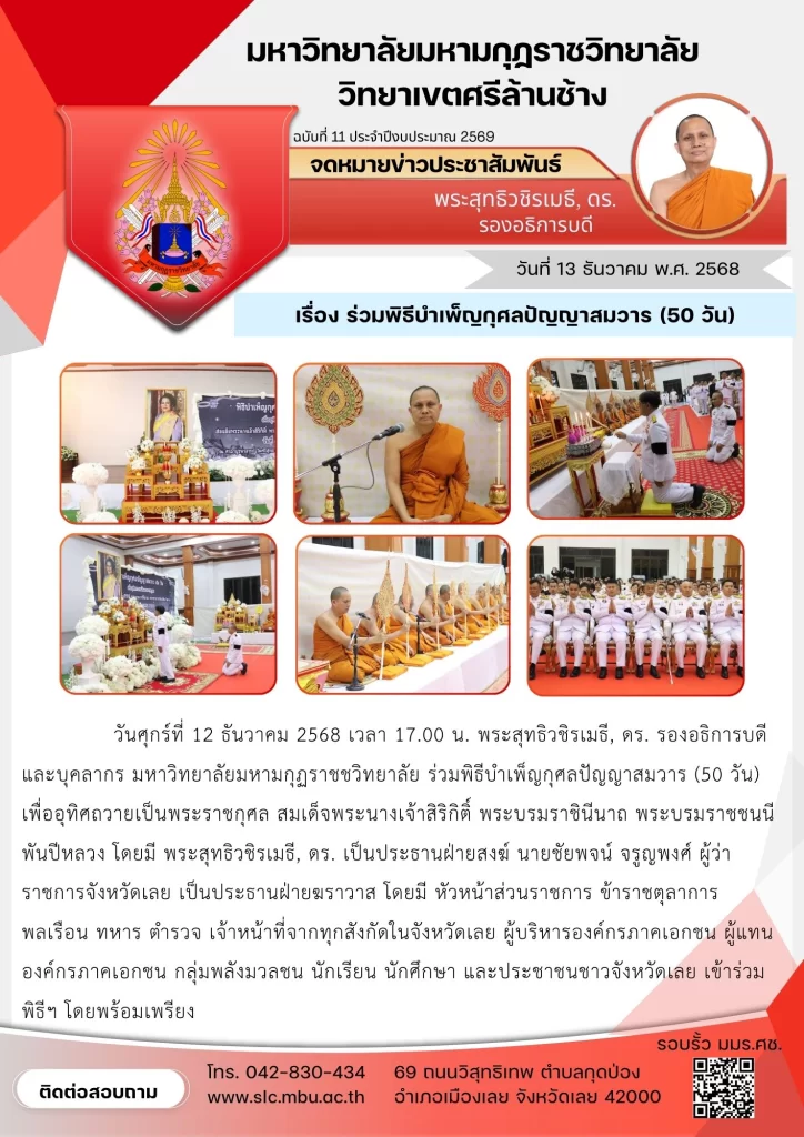 วันศุกร์ที่ 12 ธันวาคม 2568 เวลา 17.00 น. พระสุทธิวชิรเมธี, ดร. รองอธิการบดี และบุคลากร มหาวิทยาลัยมหามกุฏราชชวิทยาลัย ร่วมพิธีบำเพ็ญกุศลปัญญาสมวาร (50 วัน) เพื่ออุทิศถวายเป็นพระราชกุศล สมเด็จพระนางเจ้าสิริกิติ์ พระบรมราชินีนาถ พระบรมราชชนนีพันปีหลวง โดยมี พระสุทธิวชิรเมธี, ดร. เป็นประธานฝ่ายสงฆ์ นายชัยพจน์ จรูญพงศ์ ผู้ว่าราชการจังหวัดเลย เป็นประธานฝ่ายฆราวาส โดยมี หัวหน้าส่วนราชการ ข้าราชตุลาการ พลเรือน ทหาร ตำรวจ เจ้าหน้าที่จากทุกสังกัดในจังหวัดเลย ผู้บริหารองค์กรภาคเอกชน ผู้แทนองค์กรภาคเอกชน กลุ่มพลังมวลชน นักเรียน นักศึกษา และประชาชนชาวจังหวัดเลย เข้าร่วมพิธีฯ โดยพร้อมเพรียง