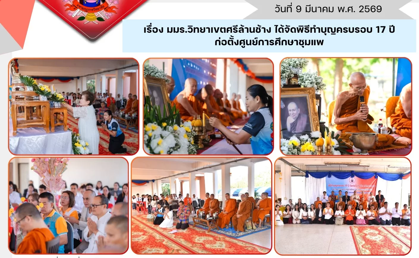 เมื่อวันที่ 8 มีนาคม 2569 มหาวิทยาลัยมหามกุฏราชวิทยาลัย วิทยาเขตศรีล้านช้าง นำโดย พระสุทธิวชิรเมธี, ดร. รองอธิการบดี พร้อมด้วย พระครูปลัดจักรพล สิริธโร, ดร. ผู้อำนวยการวิทยาลัยศาสนศาสตร์, พระมหาจิณกมล อภิรตโน, ดร., ดร.ทวีศักดิ์ ใครบุตร ผู้ช่วยอธิการบดี คณาจารย์ เจ้าหน้าที่ และศิษย์เก่าศูนย์การศึกษาชุมแพ ได้ร่วมกันจัด พิธีทำบุญครบรอบ 17 ปี การจัดตั้งศูนย์การศึกษาชุมแพ เพื่อความเป็นสิริมงคลและรำลึกถึงการก่อตั้งศูนย์การศึกษาที่มีบทบาทสำคัญในการส่งเสริมการศึกษาและการพัฒนาชุมชนท้องถิ่น