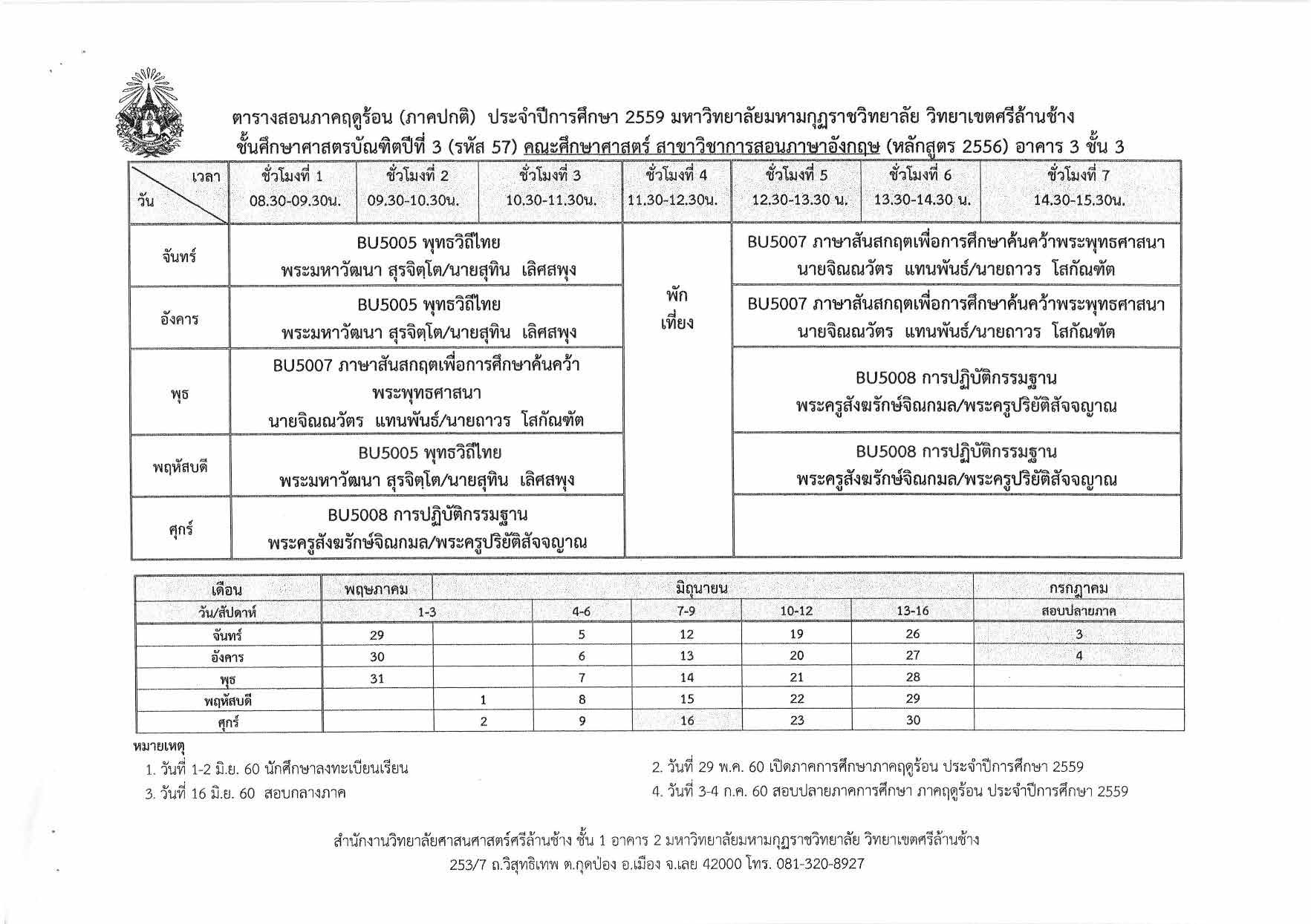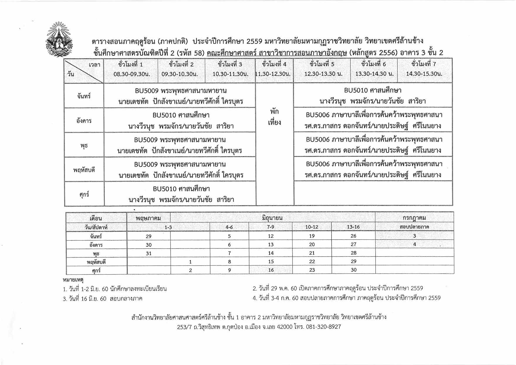 ตารางเรียนภาคการศึกษาฤดูร้อน ปีการศึกษา 2559 นักศึกษาภาคปกติ