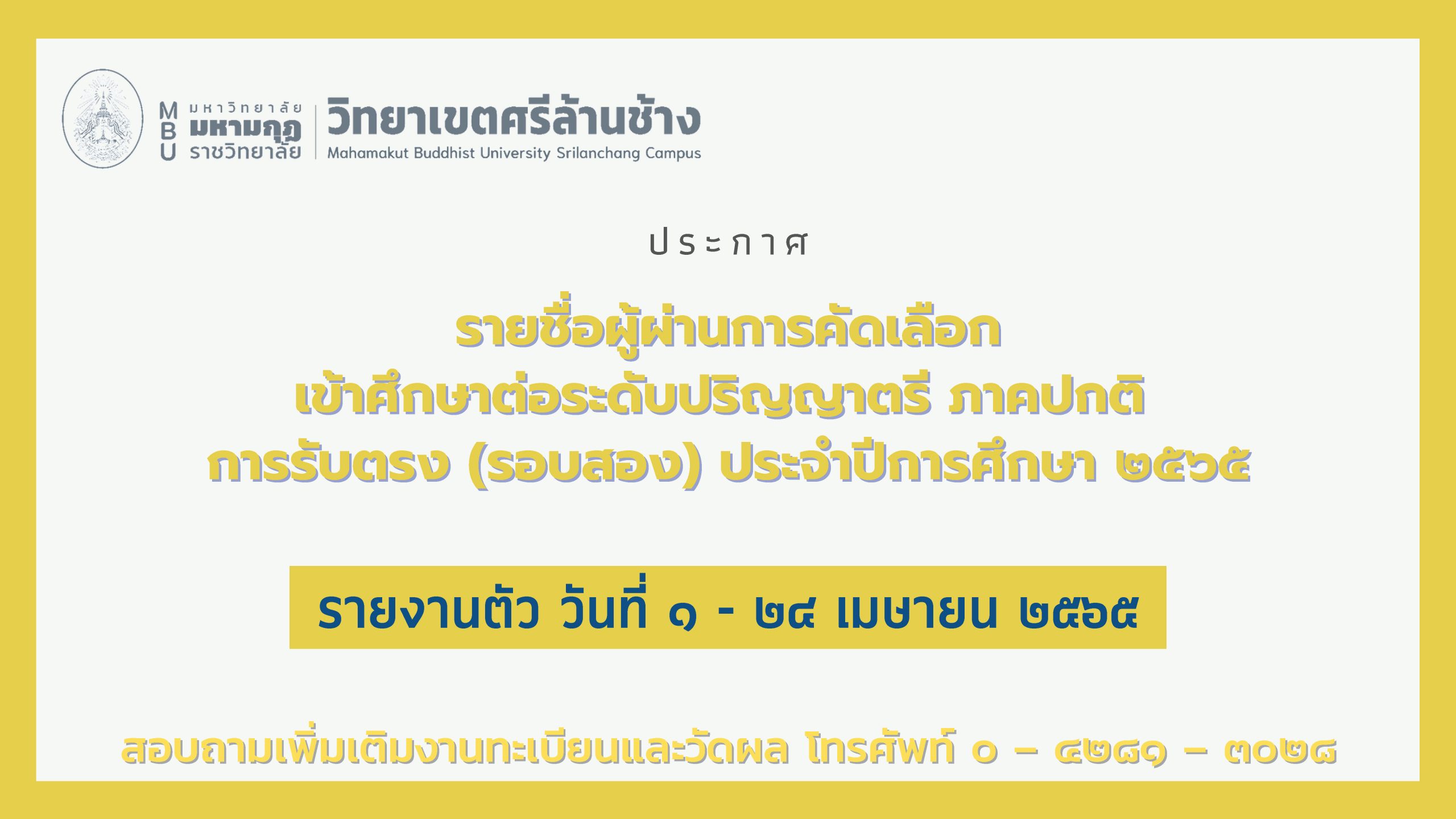 ตามที่มหาวิทยาลัยมหามกุฏราชวิทยาลัย วิทยาเขตศรีล้านช้าง อำเภอเมืองเลย จังหวัดเลย ได้เปิดรับพระภิกษุสามเณร และบุคคลทั่วไป เข้าศึกษาต่อในระดับปริญญาตรี ภาคปกติ การรับตรง (รอบสอง) ประจำปีการศึกษา 2565 นั้น บัดนี้ได้ดำเนินการสอบคัดเลือกเสร็จเรียบร้อยแล้ว จึงประกาศรายชื่อผู้ผ่านการสอบคัดเลือก ตรวจสอบรายชื่อผ่านทางเว็บไซต์ http://admissions.mbuslc.ac.th เพื่อเป็นการปฏิบัติตามมาตรการป้องกันการแพร่ระบาดของโรคติดเชื้อไวรัสโคโรนา 2019 (COVID-19) จึงให้ผู้ผ่านการสอบคัดเลือก ให้ยืนยันสิทธิ์และชำระค่าธรรมเนียมการศึกษาผ่านธนาคาร ตามขั้นตอนท้ายประกาศนี้