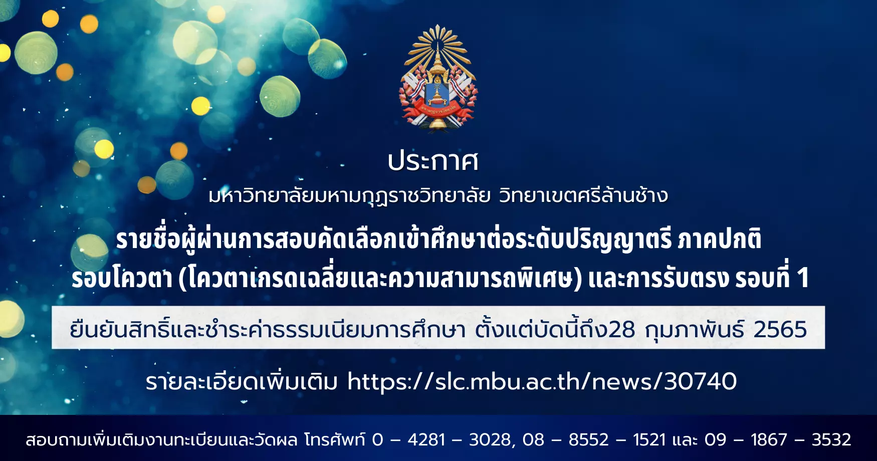 ตามที่มหาวิทยาลัยมหามกุฏราชวิทยาลัย วิทยาเขตศรีล้านช้าง อำเภอเมืองเลย จังหวัดเลย ได้เปิดรับพระภิกษุสามเณรและบุคคลทั่วไปเข้าศึกษาต่อในระดับปริญญาตรี ภาคปกติ โควตา (โควตาเกรดเฉลี่ยและความสามารถพิเศษ) และการรับตรง (รอบแรก) ประจำปีการศึกษา 2565 นั้น บัดนี้ได้ดำเนินการสอบคัดเลือกเสร็จเรียบร้อยแล้ว จึงประกาศรายชื่อผู้ผ่านการสอบคัดเลือก ตรวจสอบรายชื่อผ่านทางเว็บไซต์ http://admissions.mbuslc.ac.th