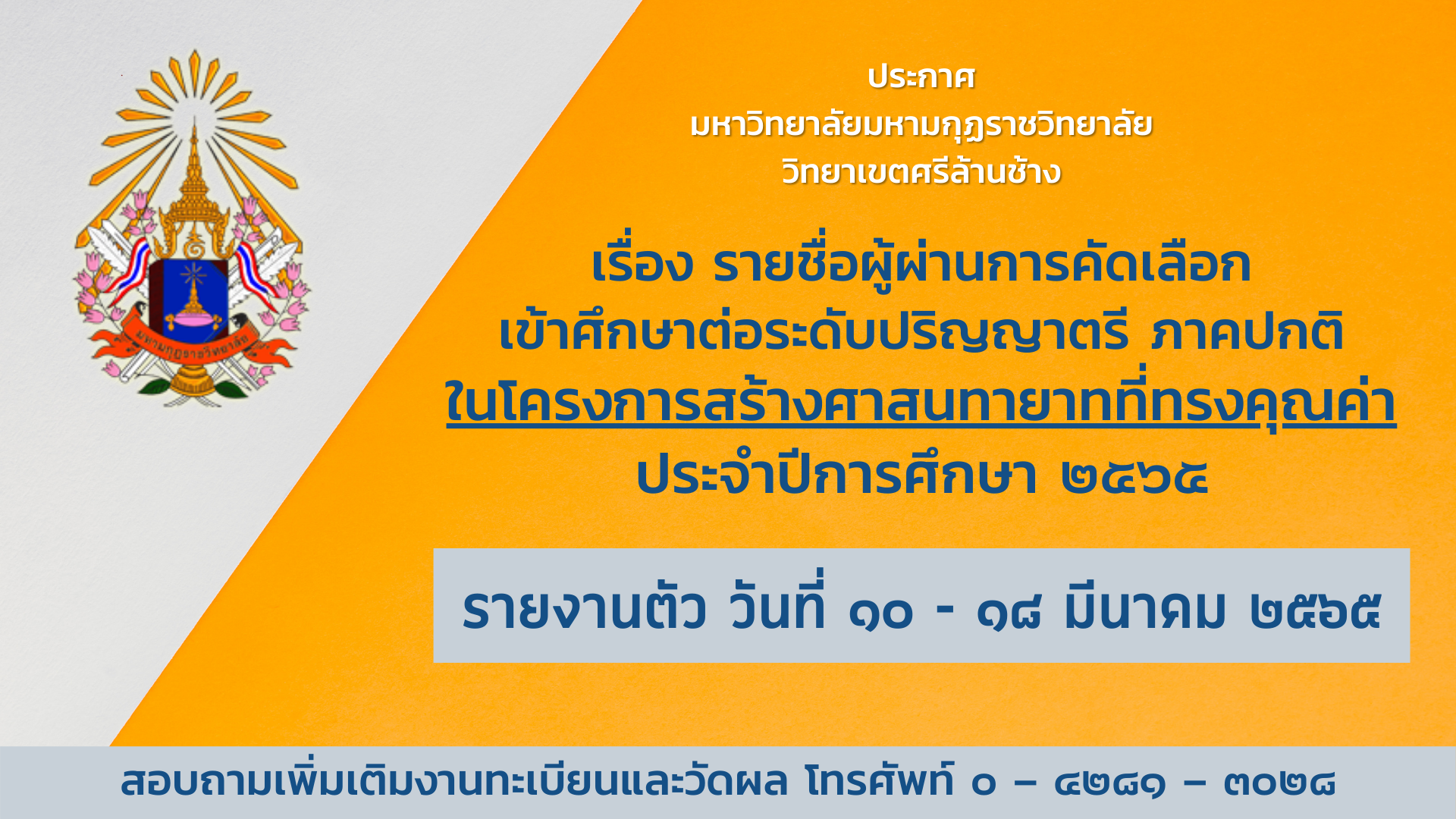 ตามที่มหาวิทยาลัยมหามกุฏราชวิทยาลัย วิทยาเขตศรีล้านช้าง อำเภอเมืองเลย จังหวัดเลย ได้เปิดรับพระภิกษุสามเณร เข้าศึกษาต่อในระดับปริญญาตรี ภาคปกติ ในโครงการสร้างศาสนทายาทที่ทรงคุณค่า ประจำปีการศึกษา 2565 นั้น บัดนี้ได้ดำเนินการสอบคัดเลือกเสร็จเรียบร้อยแล้ว จึงประกาศรายชื่อผู้ผ่านการสอบคัดเลือก ตรวจสอบรายชื่อผ่านทางเว็บไซต์ http://admissions.mbuslc.ac.th