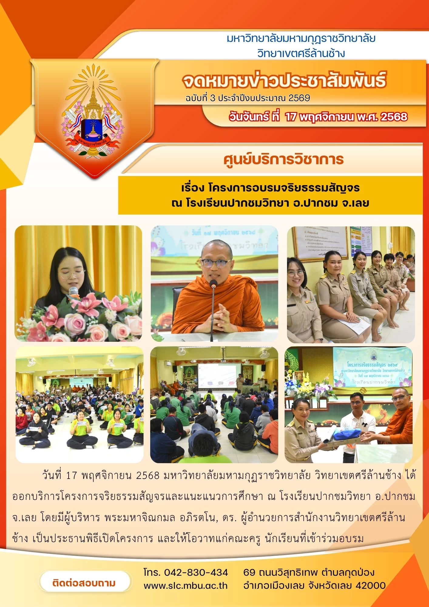วันที่ 17 พฤศจิกายน 2568 มหาวิทยาลัยมหามกุฏราชวิทยาลัย วิทยาเขตศรีล้านช้าง ได้ออกบริการโครงการจริยธรรมสัญจรและแนะแนวการศึกษา ณ โรงเรียนปากชมวิทยา อ.ปากชม จ.เลย โดยมีผู้บริหาร พระมหาจิณกมล อภิรตโน, ดร. ผู้อำนวยการสำนักงานวิทยาเขตศรีล้านช้าง เป็นประธานพิธีเปิดโครงการ และให้โอวาทแก่คณะครู นักเรียนที่เข้าร่วมอบรม