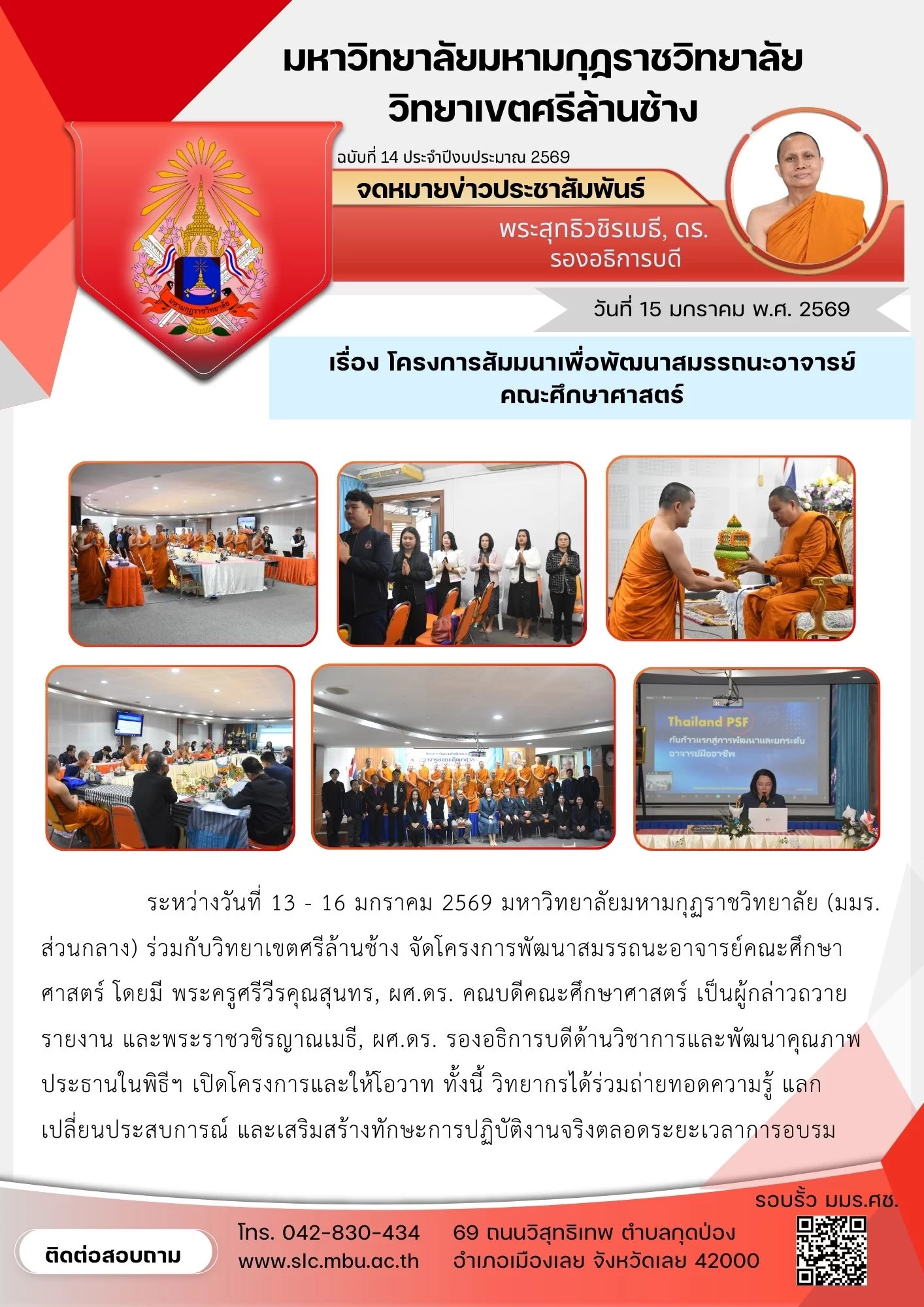 ระหว่างวันที่ 13 – 16 มกราคม 2569 มหาวิทยาลัยมหามกุฏราชวิทยาลัย (มมร. ส่วนกลาง) ร่วมกับวิทยาเขตศรีล้านช้าง จัดโครงการพัฒนาสมรรถนะอาจารย์คณะศึกษาศาสตร์ โดยมี พระครูศรีวีรคุณสุนทร, ผศ.ดร. คณบดีคณะศึกษาศาสตร์ เป็นผู้กล่าวถวายรายงาน และพระราชวชิรญาณเมธี, ผศ.ดร. รองอธิการบดีด้านวิชาการและพัฒนาคุณภาพ ประธานในพิธีฯ เปิดโครงการและให้โอวาท ทั้งนี้ วิทยากรได้ร่วมถ่ายทอดความรู้ แลกเปลี่ยนประสบการณ์ และเสริมสร้างทักษะการปฏิบัติงานจริงตลอดระยะเวลาการอบรมคณะศึกษาศาสตร์