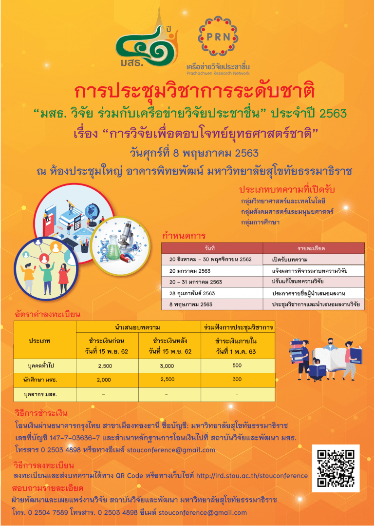 การประชุมวิชาการระดับชาติและนานาชาติ การประชุมวิชาการและการนำเสนอผลงานวิจัยระดับชาติ “มสธ. วิจัย ร่วมกับเครือข่ายวิจัยประชาชื่น” ประจำปี 25633 กันยายน 20193 กันยายน 2019