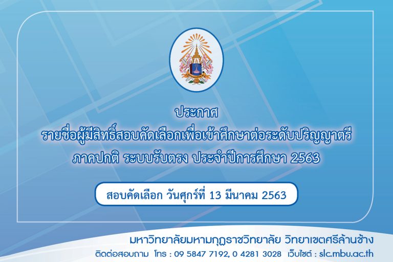 ข่าวประชาสัมพันธ์ ประกาศ รายชื่อผู้มีสิทธิ์สอบคัดเลือกเพื่อเข้าศึกษาต่อระดับปริญญาตรี นอกเวลาราชการ (วันเสาร์-อาทิตย์) การรับตรง ประจำปีการศึกษา 256310 มีนาคม 202010 มีนาคม 2020