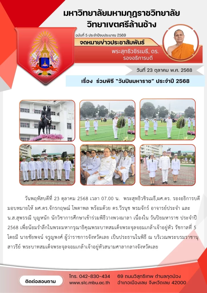 วันพฤหัสบดีที่ 23 ตุลาคม 2568 เวลา 07.00 น. พระสุทธิวชิรเมธี,ผศ.ดร. รองอธิการบดี มอบหมายให้ ผศ.ดร.จักรกฤษณ์ โพดาพล พร้อมด้วย ดร.วีรนุช พรมจักร์ อาจารย์ประจำ และ น.ส.สุพรรณี บุญหนัก นักวิชาการศึกษาเข้าร่วมพิธีวางพวงมาลา เนื่องใน วันปิยมหาราช ประจำปี 2568 เพื่อน้อมรำลึกในพระมหากรุณาธิคุณพระบาทสมเด็จพระจุลจอมเกล้าเจ้าอยู่หัว รัชกาลที่ 5 โดยมี นายชัยพจน์ จรูญพงศ์ ผู้ว่าราชการจังหวัดเลย เป็นประธานในพิธี ณ บริเวณพระบรมราชานุสาวรีย์ พระบาทสมเด็จพระจุลจอมเกล้าเจ้าอยู่หัวสนามศาลากลางจังหวัดเลย